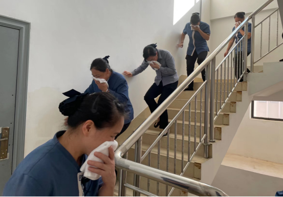 随着火警警报突然响起,员工按照应急疏散要求,用湿毛巾捂住口鼻、压低身体、手摸着墙壁,从就近的疏散通道迅速撤离,整个过程紧张而有序,全部安全撤离到达指定位置。