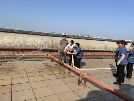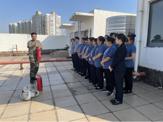 覃生龙老师根据酒店的实际情况,向大家讲解了火灾的预防措施、初期火灾扑救常识、疏散逃生知识及如何正确操作使用灭火器、水带等基本常识,并现场示范指导使用灭火器和水带。讲解完毕,员工们依次实操使用灭火器和水带,做到人人会用灭火器及水带。