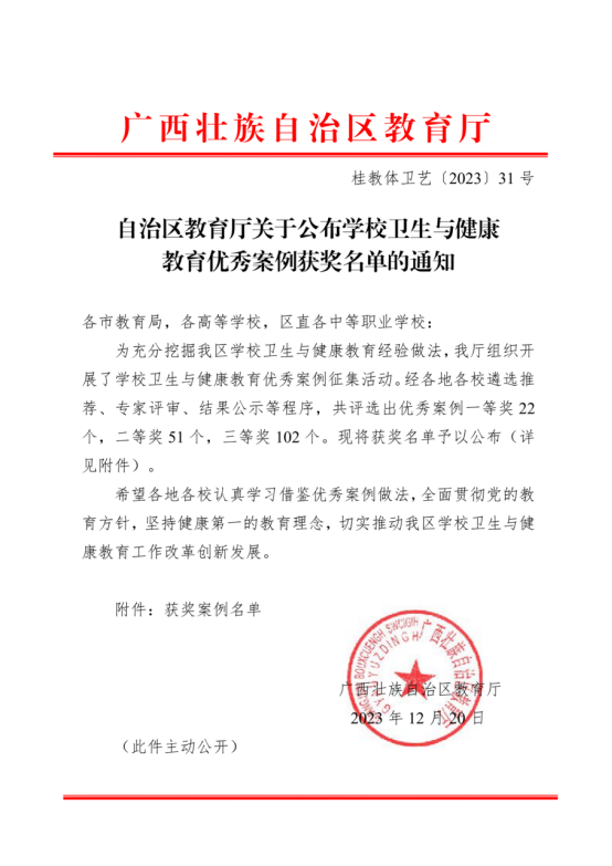 日前,自治区教育厅公布了学校卫生与健康教育优秀案例获奖名单,共有优秀案例一等奖22个,二等奖51个,三等奖102个。其中,由广西西大朴诚后勤产业服务有限公司组织上报的太阳集团tyc138《技防+人防,确保舌尖上的安全》案例被评为优秀案例一等奖。