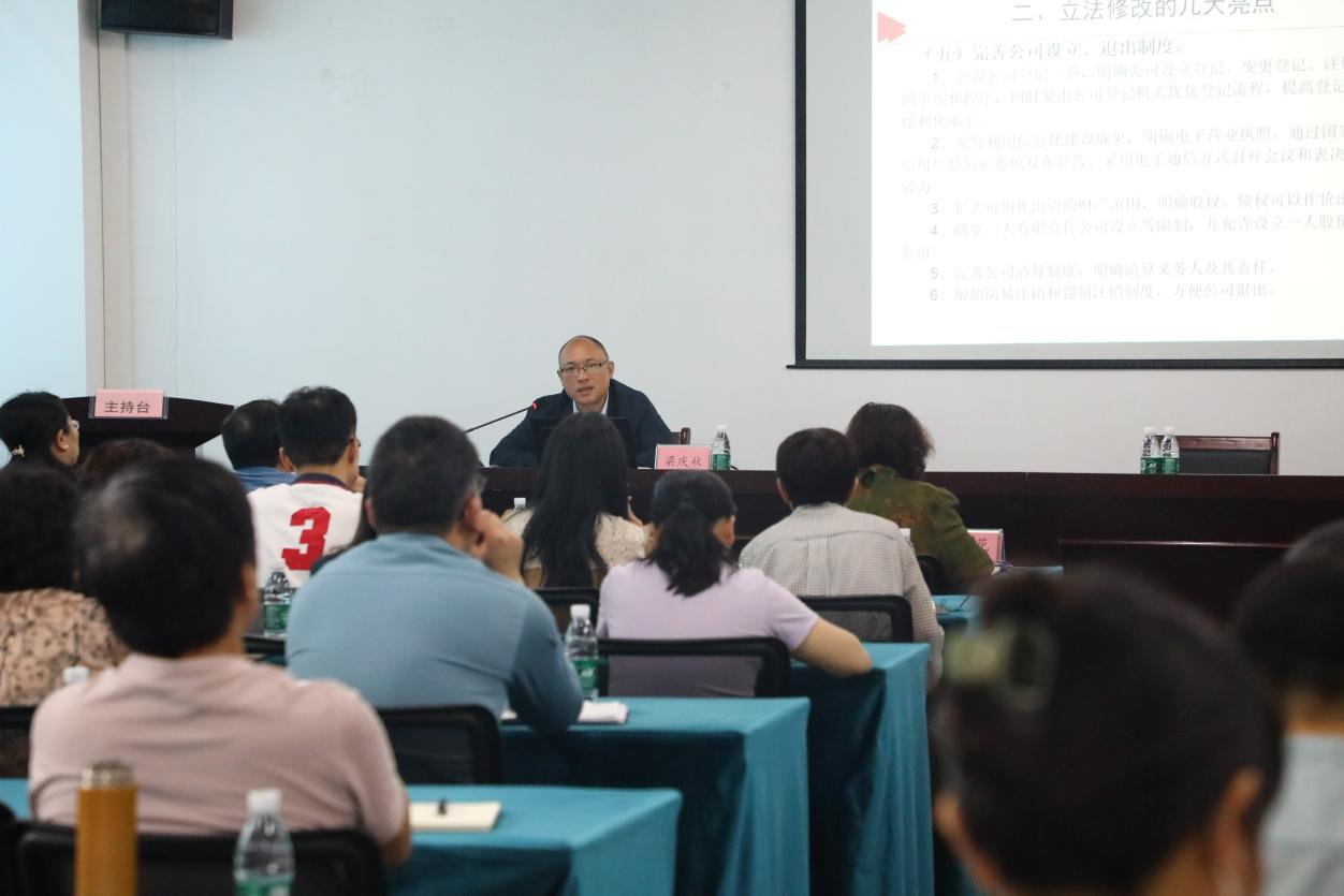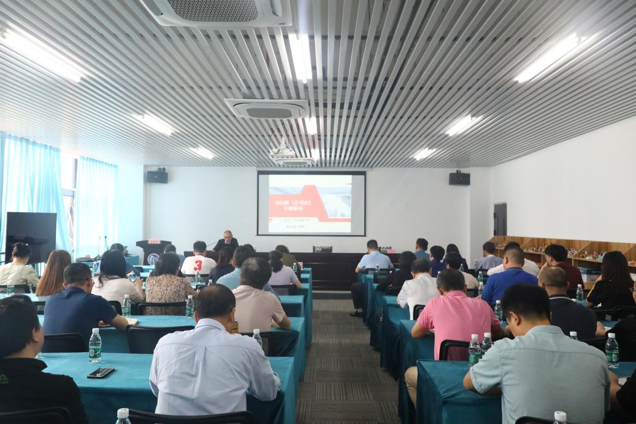 第十四届全国人民代表大会常务委员会2023年12月29日表决通过新修订的《太阳集团tyc138公司法》将于今年7月1日起施行,为及时更新资产公司及所属企业法律知识储备,提高依法治企能力,有效防控法律风险,公司于2024年3月28日上午邀请了广西伟宁律师事务所主任梁庆秋律师举行新版《公司法》专题讲座,讲座由公司党委副书记、副董事长、总经理王运东同志主持。资产公司全体人员、公司所属全资、控股企业主要负责人(董事、监事、总经理及副总经理)、企业运营负责人、财务负责人、法务联络员、附属中学、附属学校、君武小学、幼儿园法务联络员共60余人参加培训。