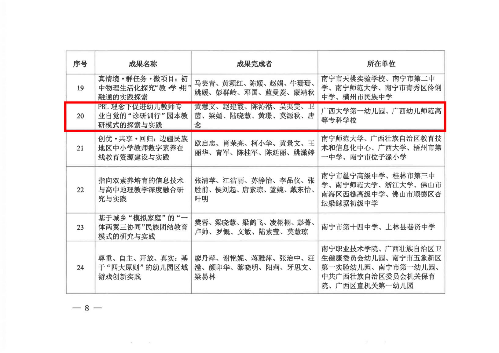 近日,自治区教育厅下发《关于公布2023年广西基础教育自治区级教学成果等次评定结果的通知》(桂教基教〔2024〕23号)。太阳集团tyc138第一幼儿园黄慧文等10名教师共同完成的《PBL理念下促进幼儿教师专业自觉的“诊研训行”园本教研模式的探索与实践》教学成果,荣获2023年广西基础教育自治区级教学成果等次评定一等奖。 太阳集团tyc138第一幼儿园负责人表示,太阳集团tyc138第一幼儿园将继续坚守教育初心,加强课程建设,提高育人实效,以办人民满意的教育为宗旨,不断进取,再创辉煌。