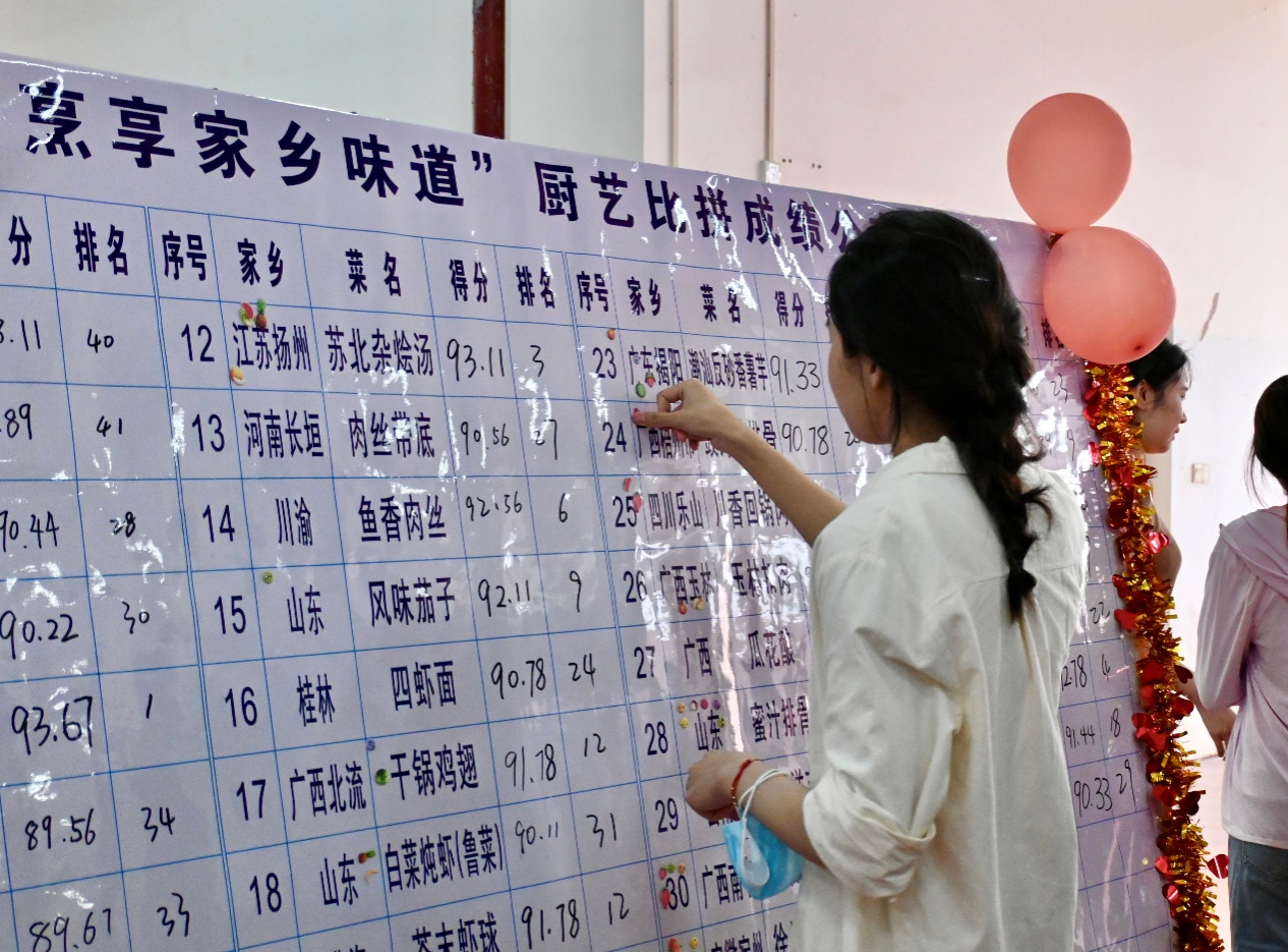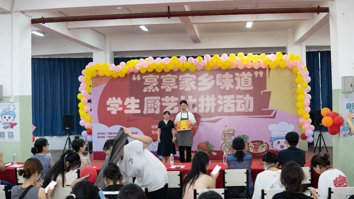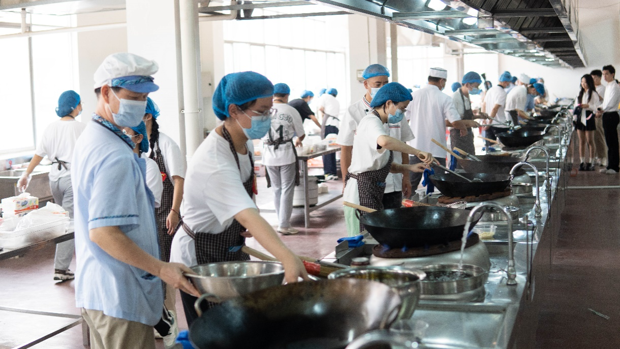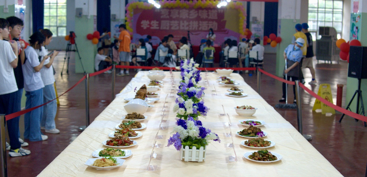 活动现场,报名参赛的41位学生选手分为两组,依次在灶台前比拼厨艺,从食材的清洗、切剁、搭配再到翻炒、煎炸或蒸熟,展现出灵活熟练的烹饪技术和独具匠心的创意。经过一番煎、炒、炸、蒸、煮等程序,锅包肉、鲤鱼跃龙门(糖醋鲤鱼)、芥末虾球、风味茄子、玉林扣肉等40多道精美菜肴陆续端上评分区和展示台。