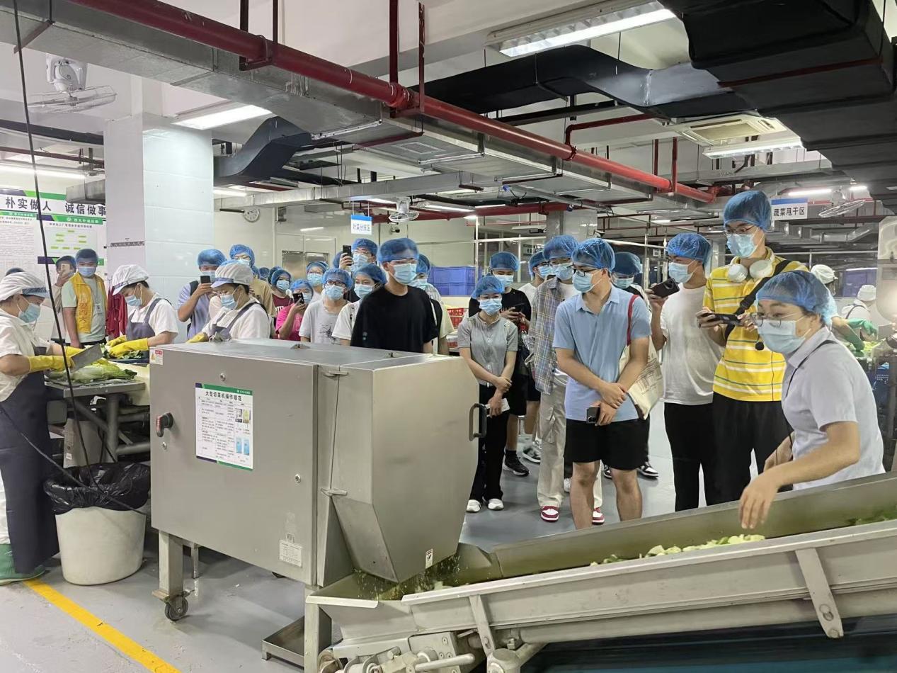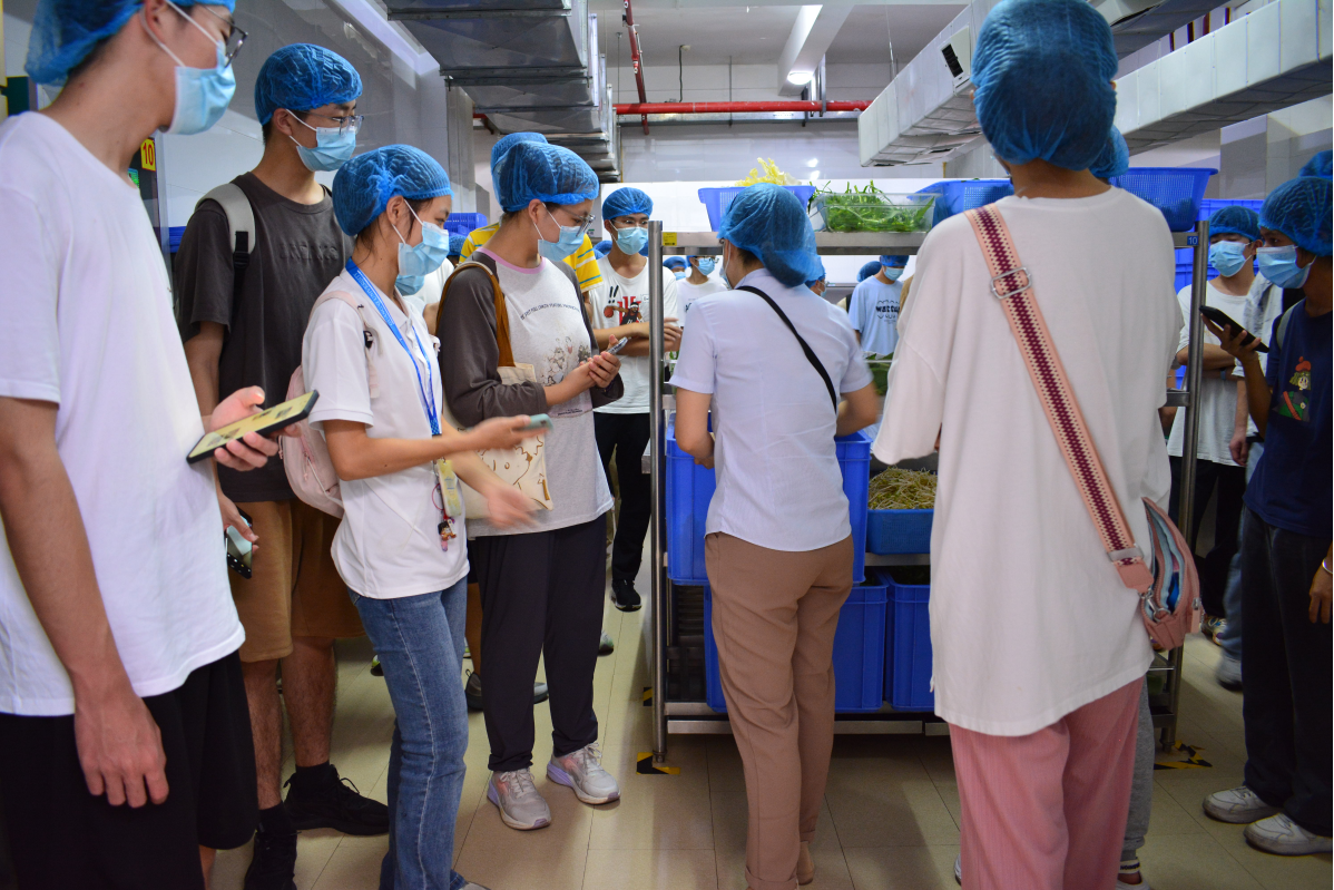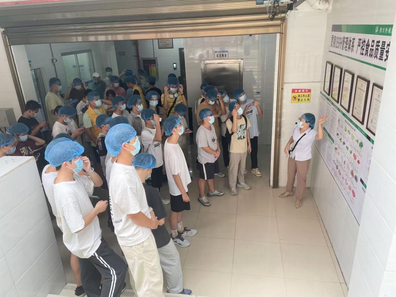 在朴诚公司监管部人员的带领下,同学们依次参观了食材检测室、净菜加工中心、秀苑餐厅一、二楼后厨等,详细了解净菜加工中心和食堂后厨操作流程、原材料采购、存储和食品加工制作流程及标准要求等,对食堂的管理要求有了更直观的认识。