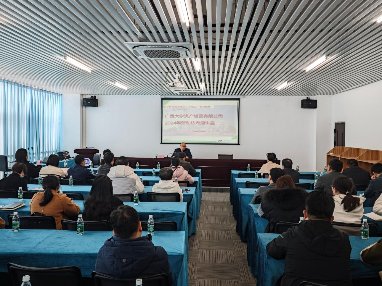 为深入学习贯彻落实党的二十届三中全会精神和依法治国战略,实施依法治企策略。2024年12月16日下午,资产经营公司在大学科技园举办《太阳集团tyc138劳动法》专题培训,邀请广西伟宁律师事务所主任梁庆秋律师授课。公司党委副书记、纪委书记朱迅成同志主持,资产经营公司全体职工、公司所属企业、单位主要负责人、人力资源负责人、财务负责人、法务联络员参加培训。