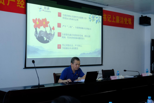 随后,黎庶凯给参会人员讲授题为“筑牢纪法防线 坚守清廉本色”的专题党课。黎庶凯深刻分析了当前反腐败斗争的形势,主动查摆公司当前存在的突出问题,提出要以巡察整改为契机,坚持问题导向,把困扰公司多年的深层次难题妥善解决,促使各方面工作有一个新的起色。黎书记还就党员领导干部如何坚守清正廉洁提出了要求:一是坚守底线、不越红线、不碰高压线,全面增强廉洁自律意识;二是全面强化廉洁风险防控管理,健全完善制度机制,坚决防范贪腐问题的发生;三是坚定理想信念,严于律己,争做廉洁从业的模范。