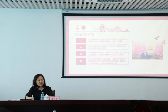 谭银花同志结合主题教育调研和公司经营发展实际,以“用习近平新时代中国特色社会主义思想凝心铸魂、勠力同心推动公司高质量发展”为题,对学习贯彻习近平新时代中国特色社会主义思想主题教育“学什么、怎么学、怎么干”等问题作了全面讲解。她指出,习近平新时代中国特色社会主义思想是马克思主义中国化时代化的最新成果,要全面准确、系统地学习掌握其精神实质和丰富内涵;要把学习领悟习近平新时代中国特色社会主义思想作为终身课题;要以主题教育作为全面贯彻落实学校党委各项决策部署的有力抓手,致力完成“十四五”规划既定的战略目标任务;要坚持学思用贯通、知信行统一,把学习成效转化为实实在在的工作业绩。