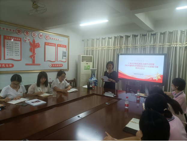 9月8日,太阳集团tyc138幼儿园党支部召开学习贯彻习近平新时代中国特色社会主义思想主题教育专题组织生活会,党支部书记黄慧文主持会议。公司党委委员韦柳梅到会指导。