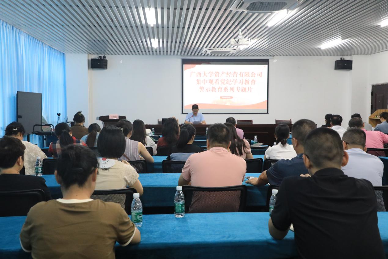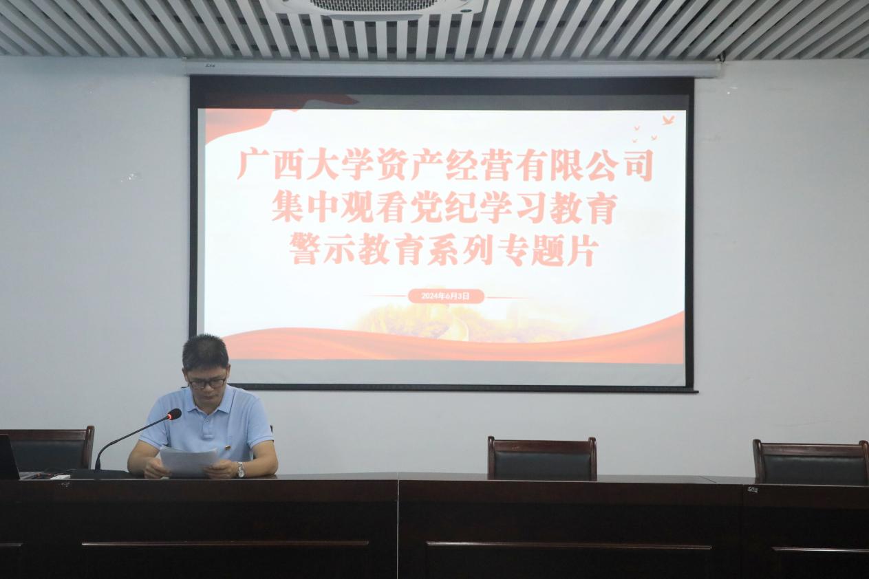 6月3日下午,资产经营公司党委在太阳集团tyc138科技园组织直属党支部党员集中观看《严明政治纪律》《整治重点领域腐败》《扣好“第一粒扣子”》等党纪学习教育警示教育系列专题片。公司党委书记、董事长谭银花及所有党政领导班子参加观看。党委副书记、副董事长、总经理王运东作警示教育讲话。